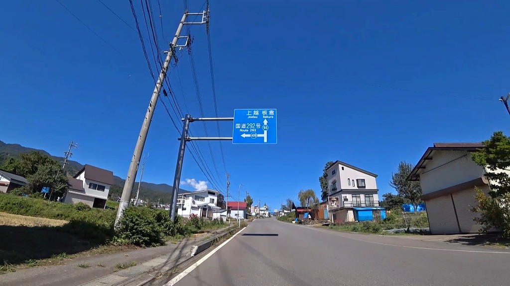 案内標識は小さく、交差点も新潟県道・長野県道95号上越飯山線がどちらか分かりづらいので注意