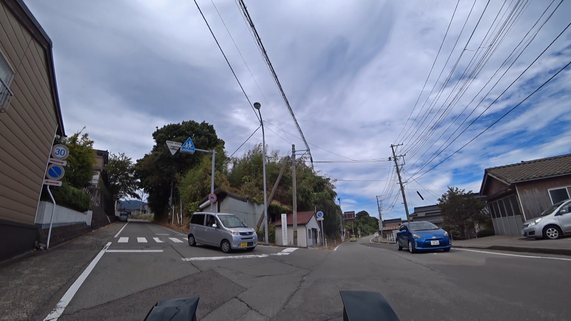歩道のない住宅街の道を進みます。@歩行者注意