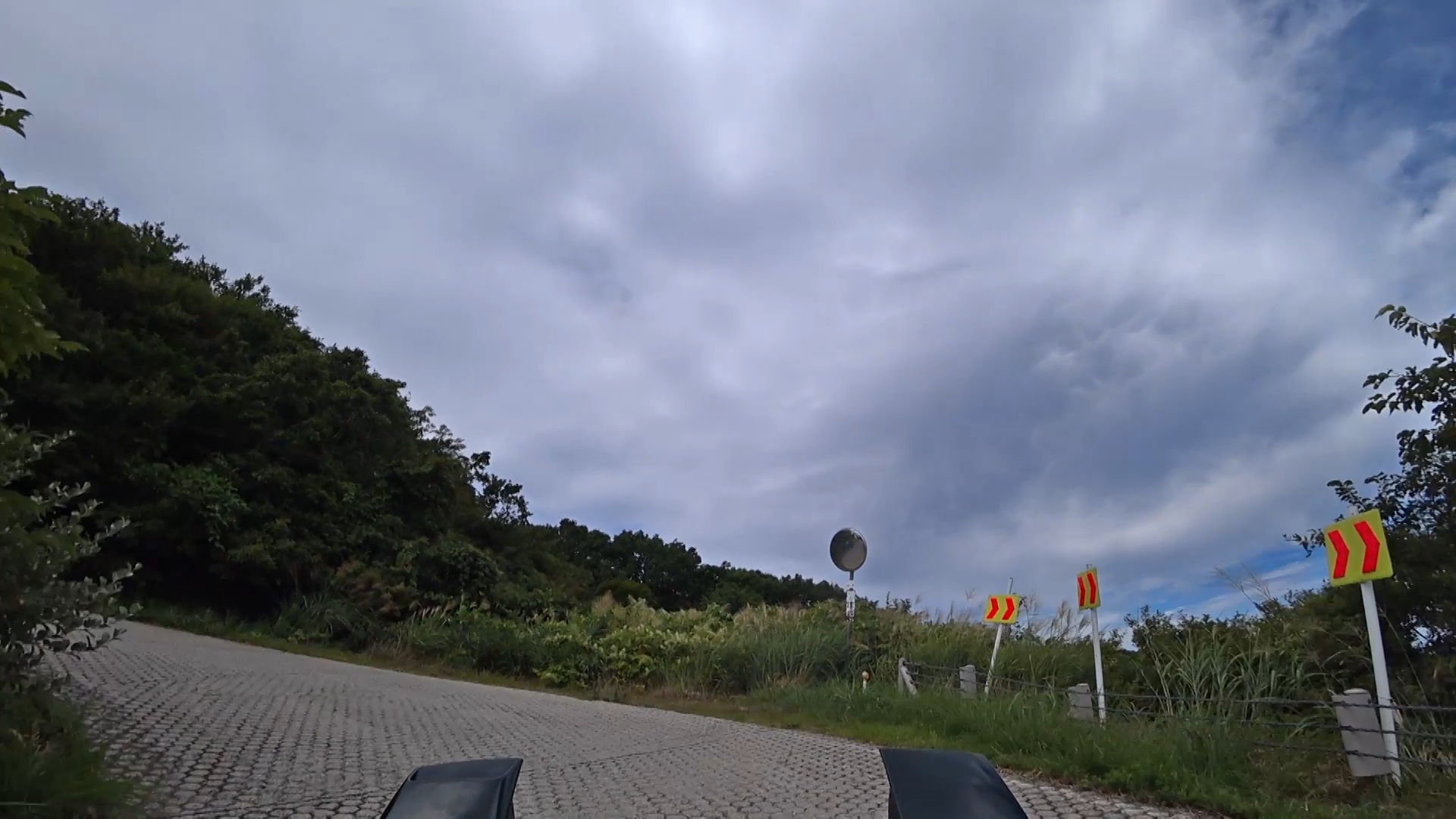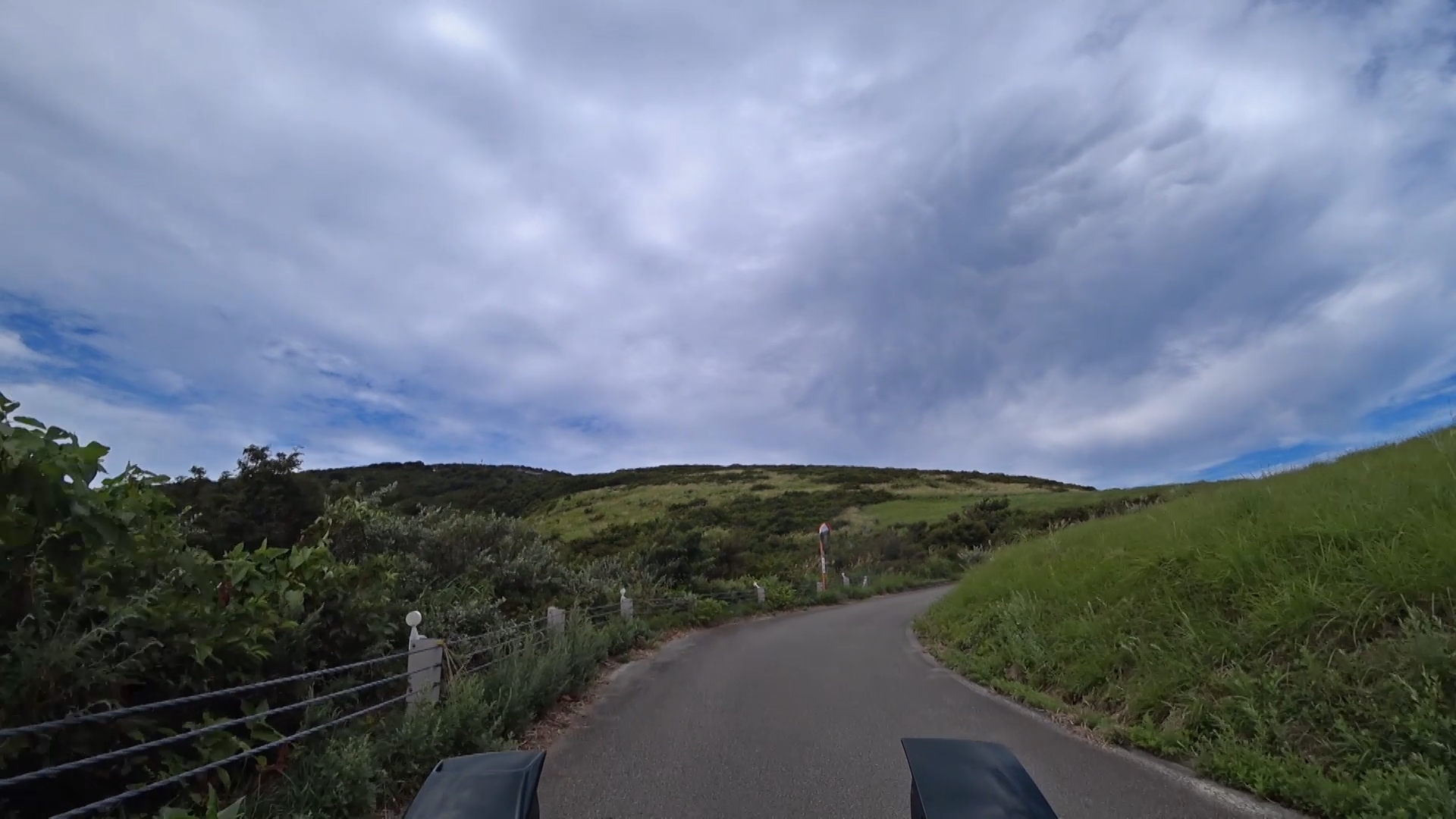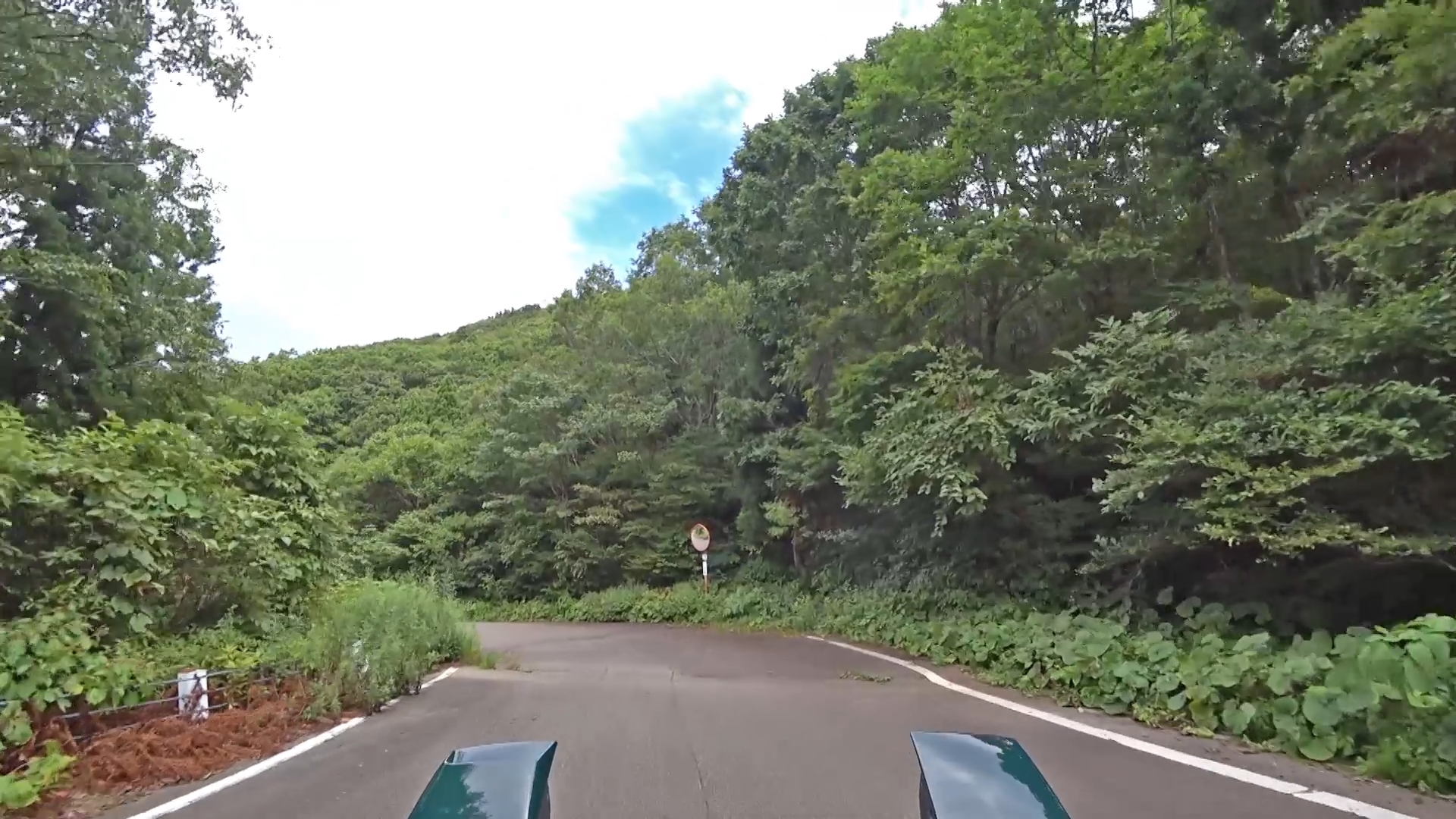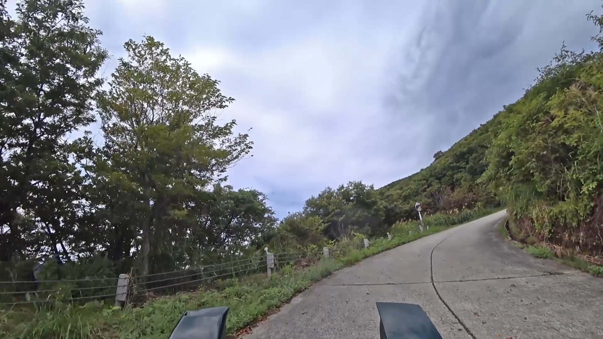 暫くするとセンターラインが消え、A狭路区間が入り混じる区間になります。(狭路区間はドンデン山を越え、ゴール地点手前まで続きます。)