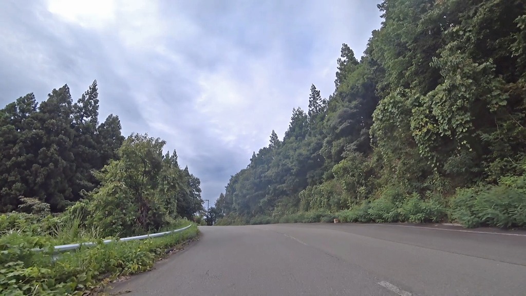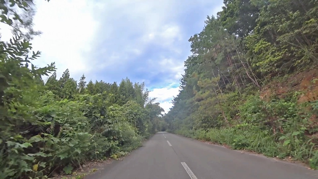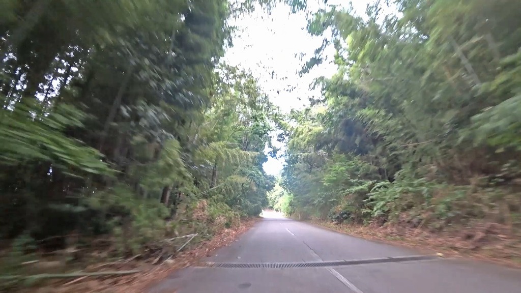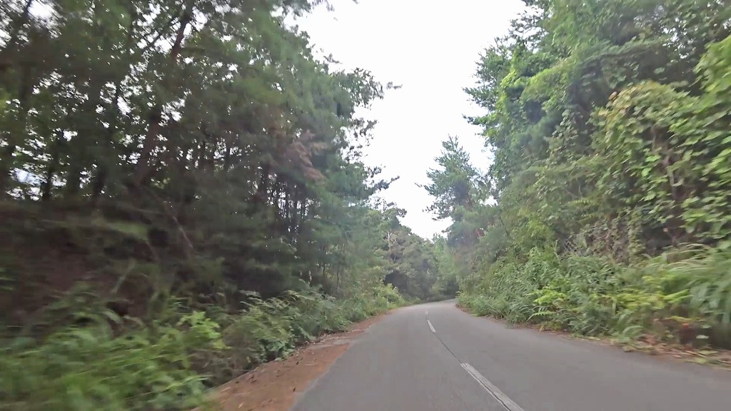 多くの場所でセンターラインのある片側一車線の道ですが、森の中、山の中を走る区間では、道路脇から雑草や木の枝が道にはみ出しており、かなり圧迫感があるだけではなく、道の真ん中を走る場面もありました。