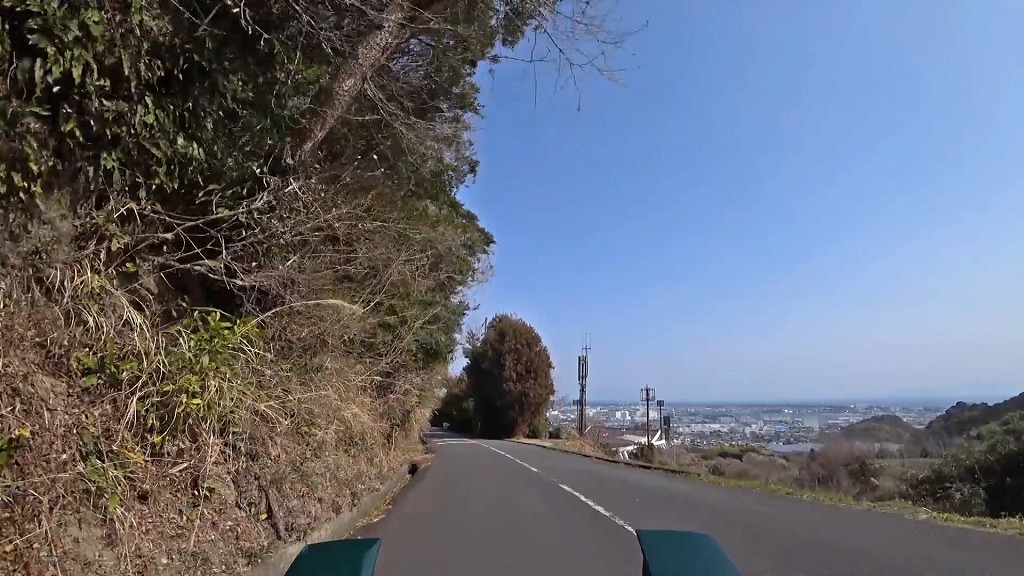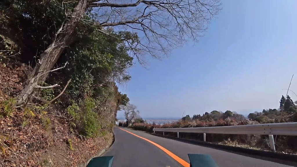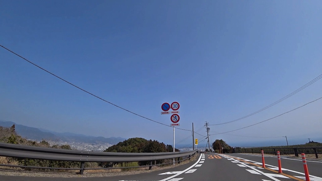 所々で折戸湾、清水港方面を見渡せるような場所がありますが、中間部分では道が細いうえに、山側には開いた側溝。谷側は崖となっているので、頂上付近や駐車スペースのある場所に駐車して景色を楽しんだ方が良いと思われます。