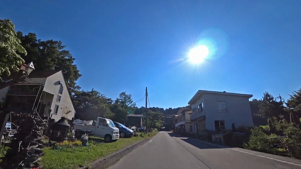 その先、道幅が狭くなり、民家などが建ち並ぶ場所へ。J歩行者注意