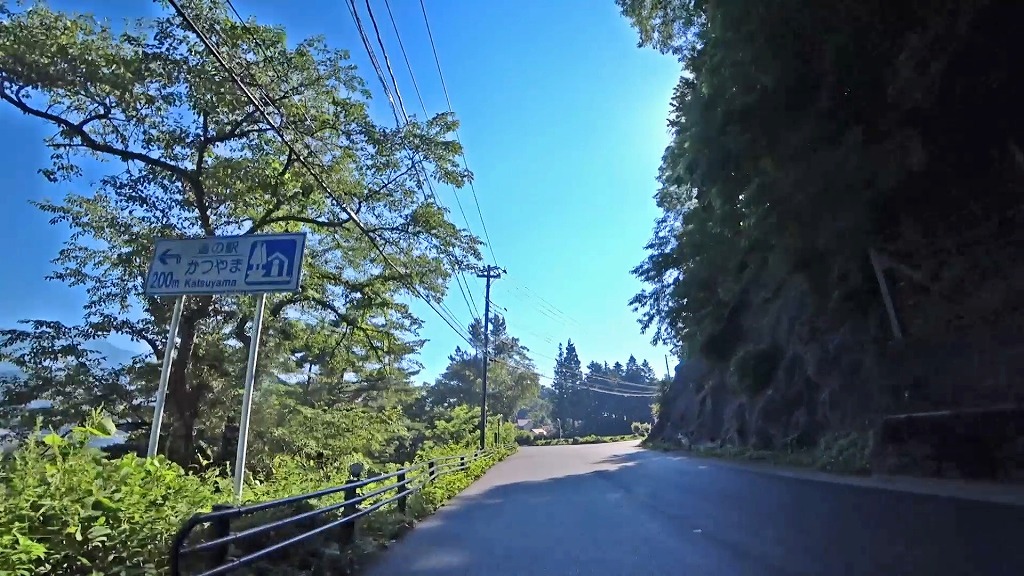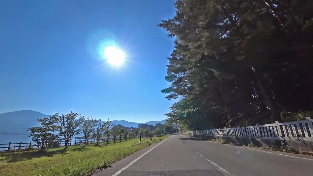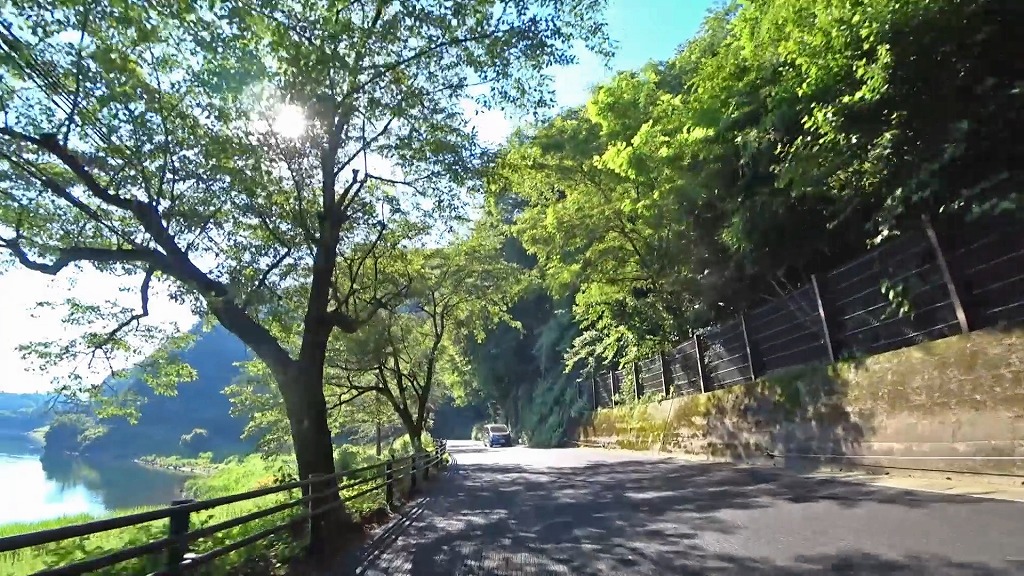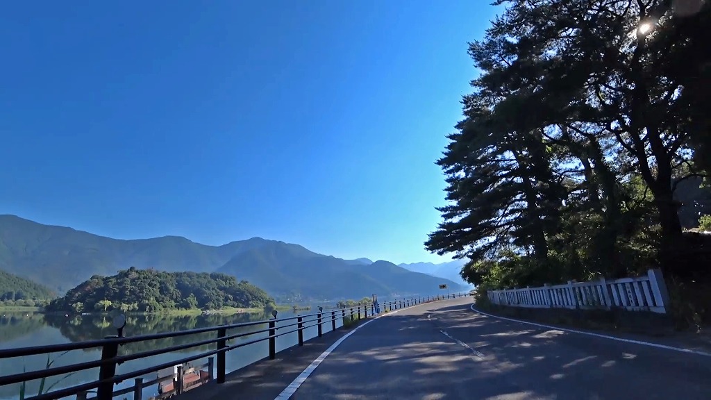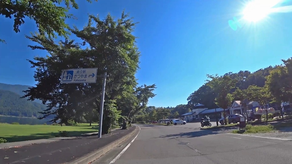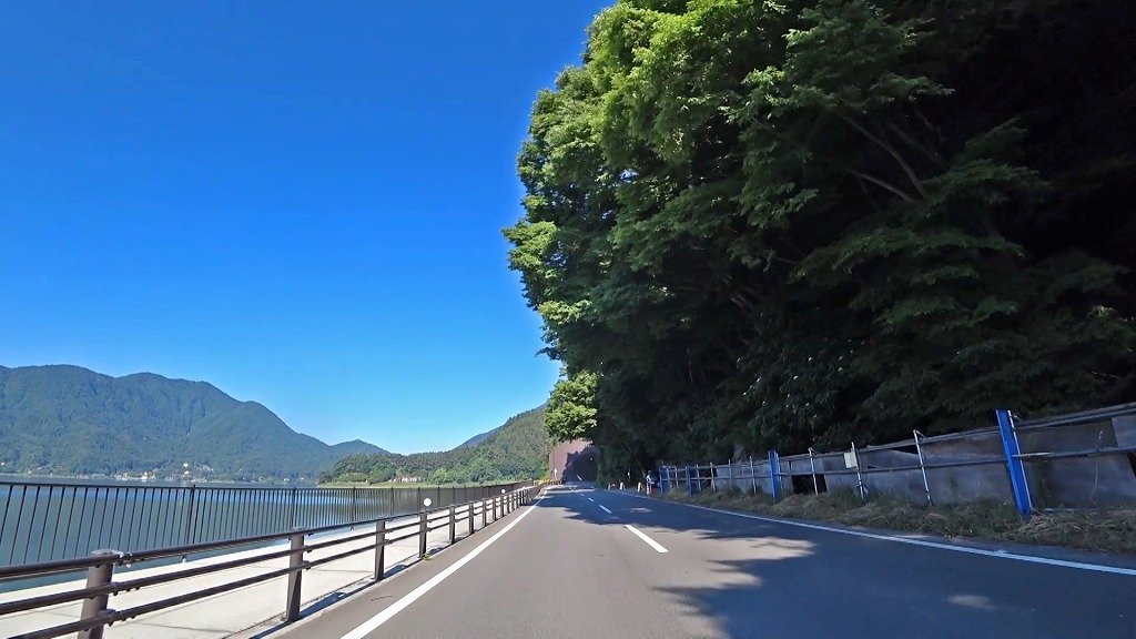 道の駅かつやまを出発し、まず静かな湖畔沿いを東へと進みます。この区間は交通量が比較的少なく、落ち着いた風景が広がります。