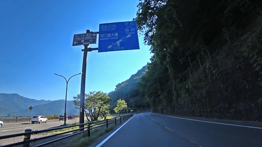 - 山梨県富士吉田市から南巨摩郡身延町を結ぶ国道300号 この内、他の国道と重複していない単独区間では本栖みちと呼ばれています。 今回はこの本栖みちを山梨県南都留郡富士河口湖町にある国道139号との交差点(本栖交差点)から同じく南巨摩郡身延町にある国道52号との交差点(上沢交差点)までの約25kmのドライブコースです。