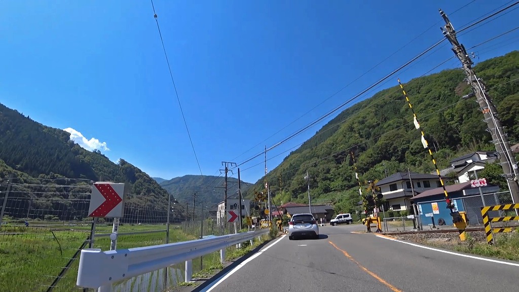 もう少し手前から標識出しておいても良い気がします。踏切部分は車幅の狭くなり、一応B踏切注意