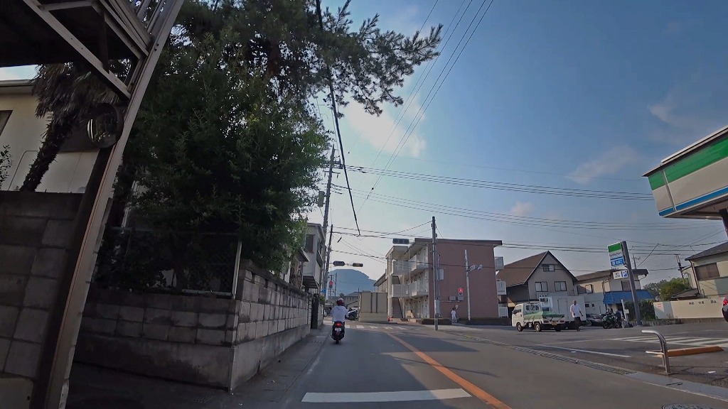 坂道を下り切ると、住宅や商店の並ぶ細い道へ。