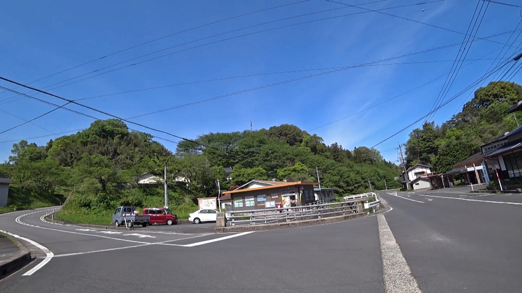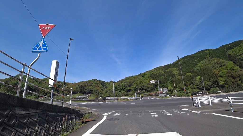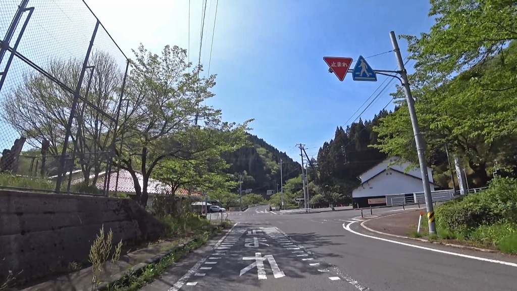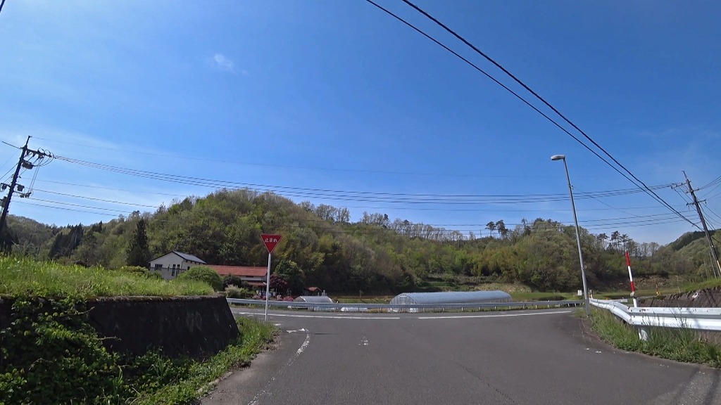下り坂のカーブの先に交差点がありますが、一時停止なので注意。