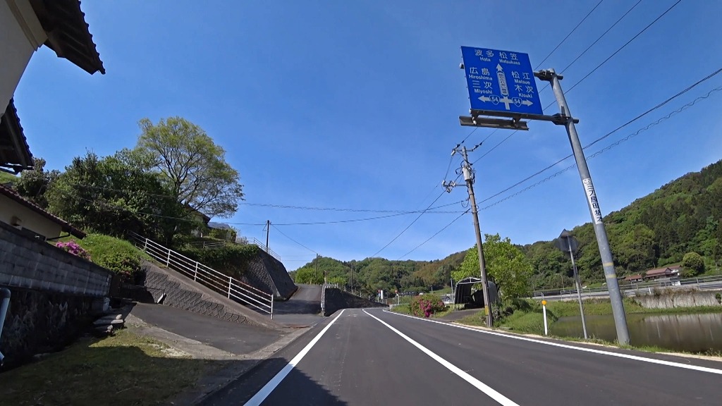 最後は島根県飯石郡飯南町にある国道54号との交差点(信号なし)にて(G)ゴール。(1:08:56)