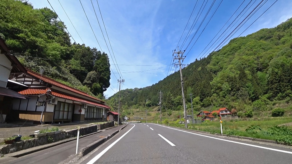島根県道166号美郷飯南線を美郷町方面へ進むと、周囲は緑豊かな山々に囲まれ、のどかな田園風景が広がります。