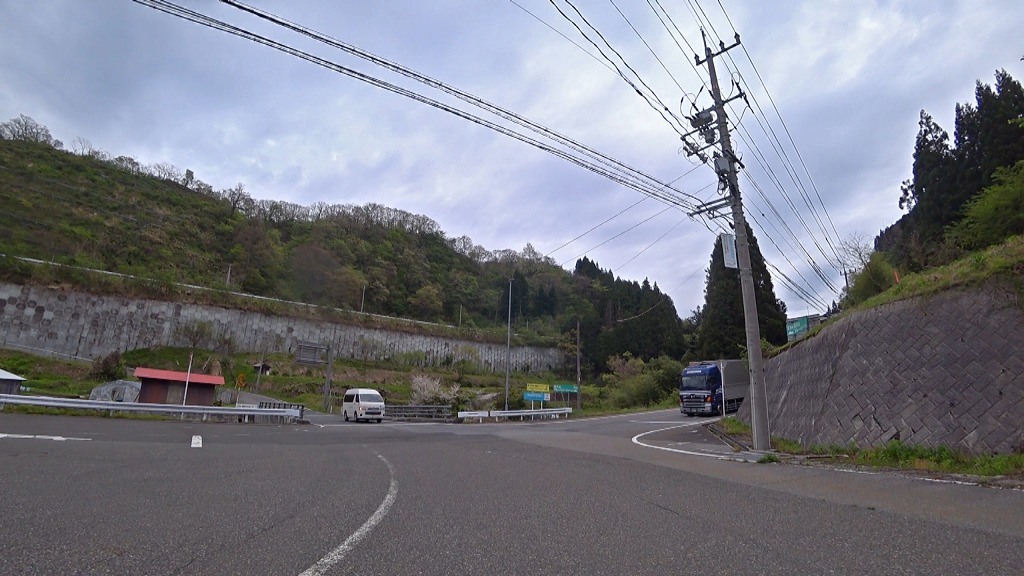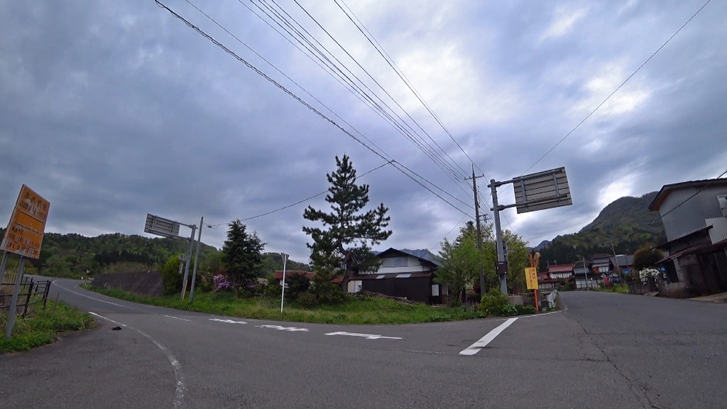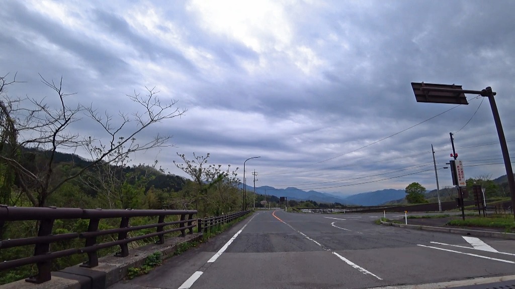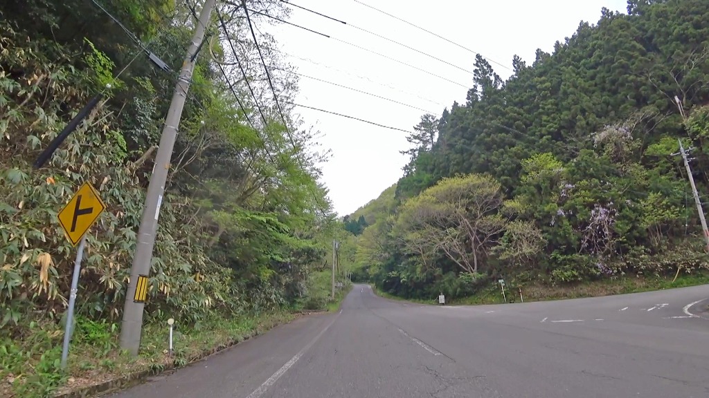 急カーブ区間を抜け直ぐに現れる鳥取県道315号如来原御机線とのF交差点4(信号なし)。(0:21:35)