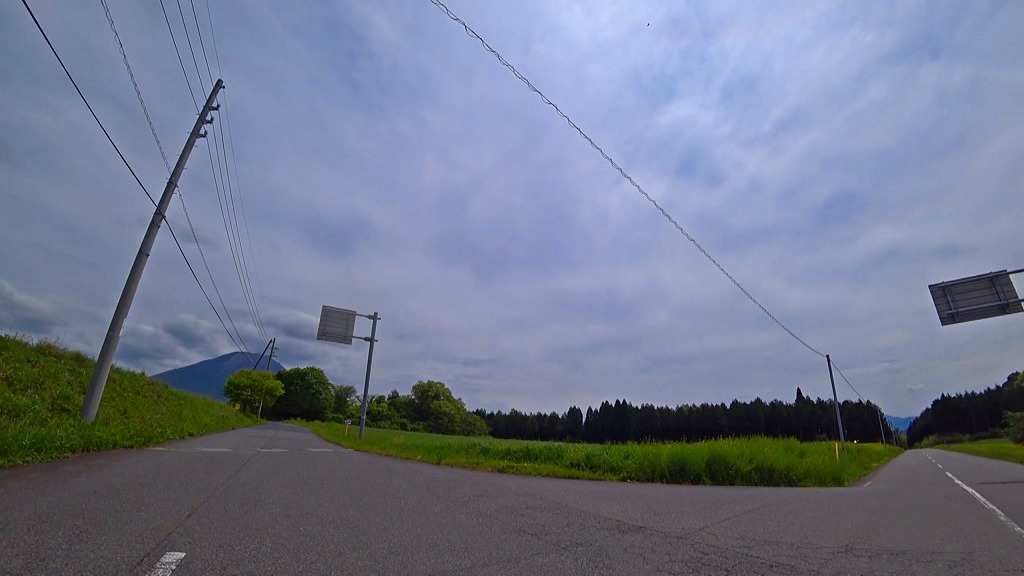 気持ちの良い道を進んで行くと鳥取県道45号倉吉江府溝口線とのB交差点3(信号なし)が現れます。(06:46)