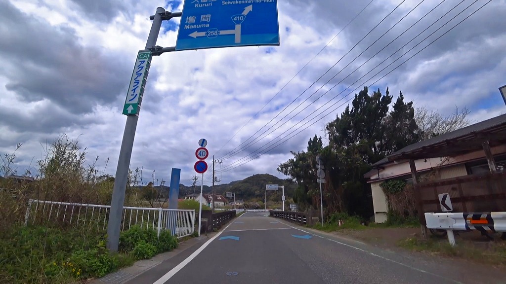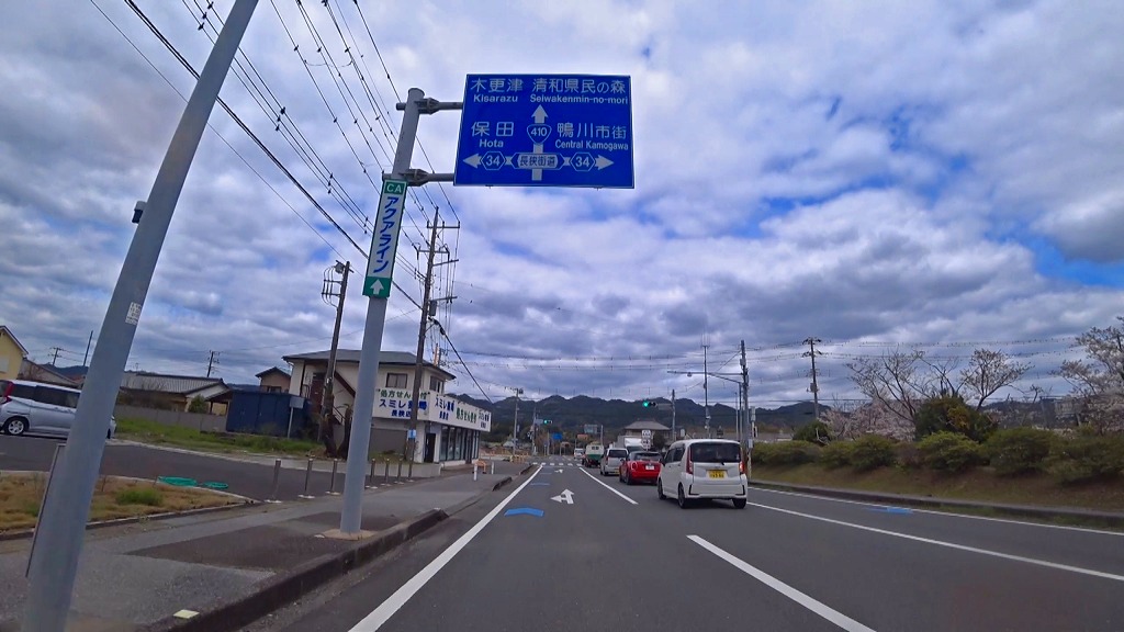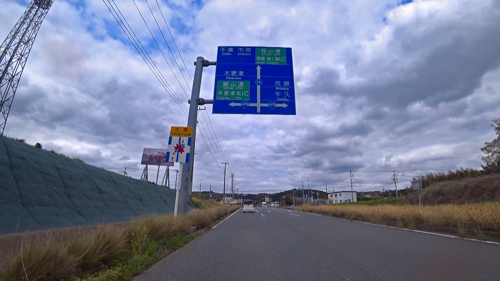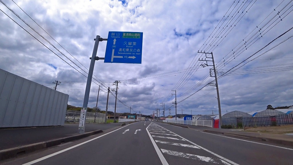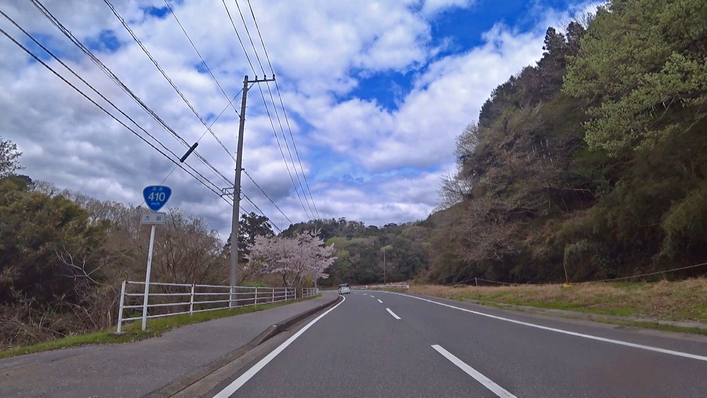 今回はこの国道410号を千葉県南房総市にある国道128号(外房黒潮ライン)との交差点(加茂交差点)から房総半島中央を北上し、袖ケ浦市にある国道409号との交差点(三高交差点)までの約50kmのドライブコースです。