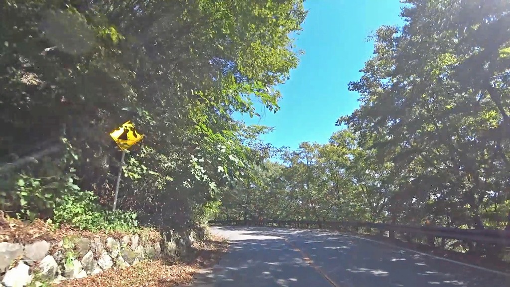 ここから峠道へ。かなり長い区間、急なカーブが休みなく続きます。Aここから急カーブ区間注意