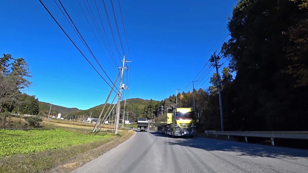 道の周辺には、採石・砕石場が多くある為かダンプカーが多く走っています。