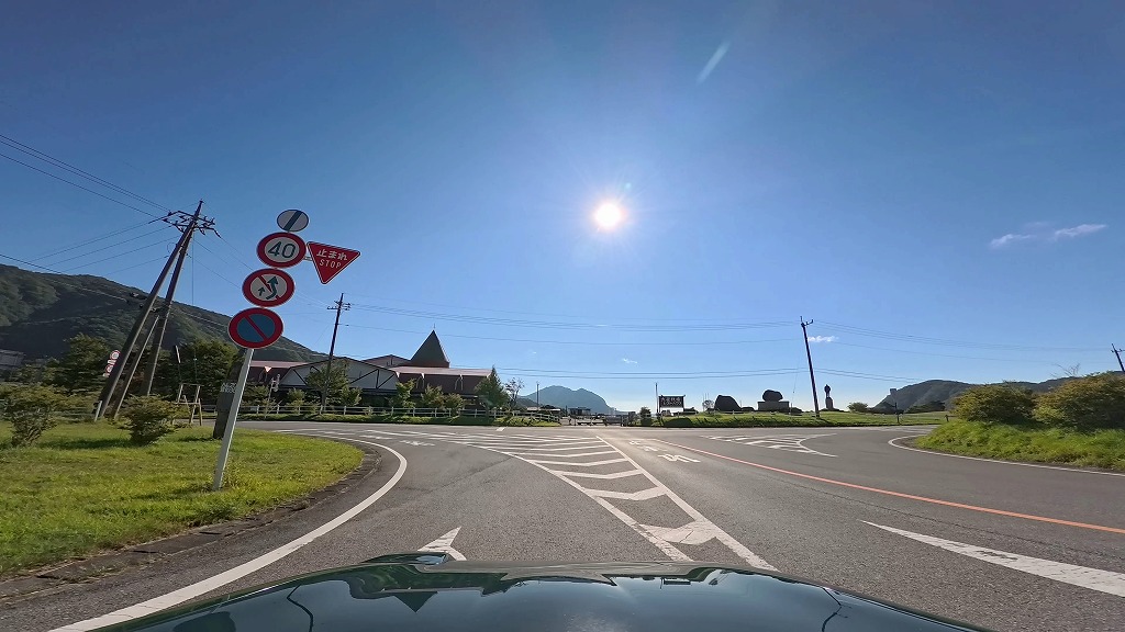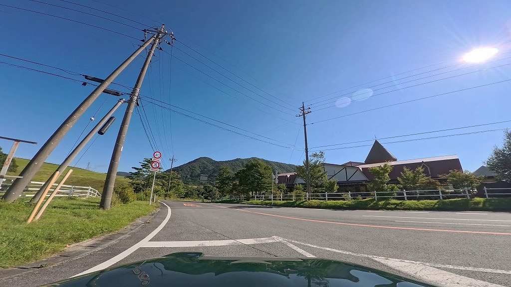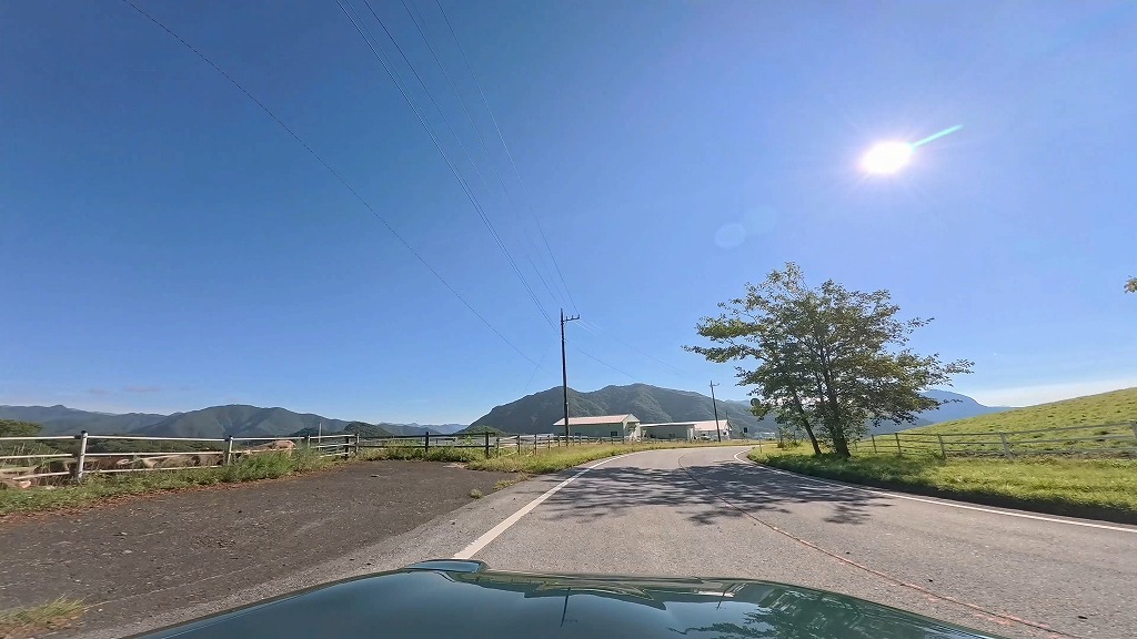 牧場の道を進むと、大笹牧場のレストハウス前のF交差点1(信号なし)が現れます。(24:26)