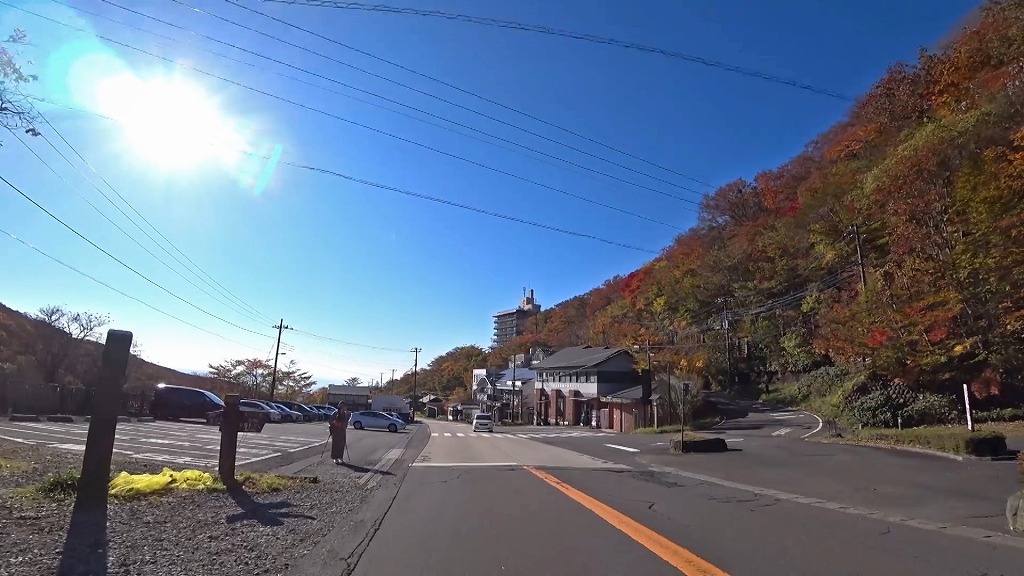 周囲には宿泊施設やおみやげ屋さんなどが建ち並び、歩行者も多いので注意が必要。D歩行者注意。