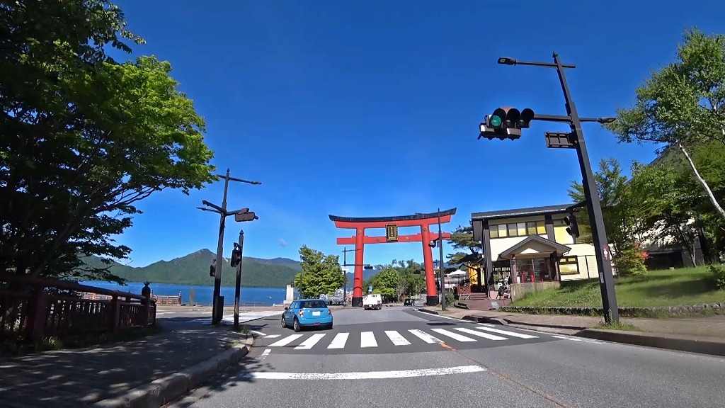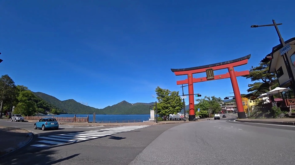 正面には二荒山神社 中宮祠 大鳥居と中禅寺湖