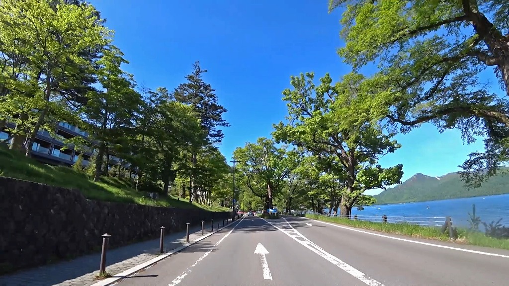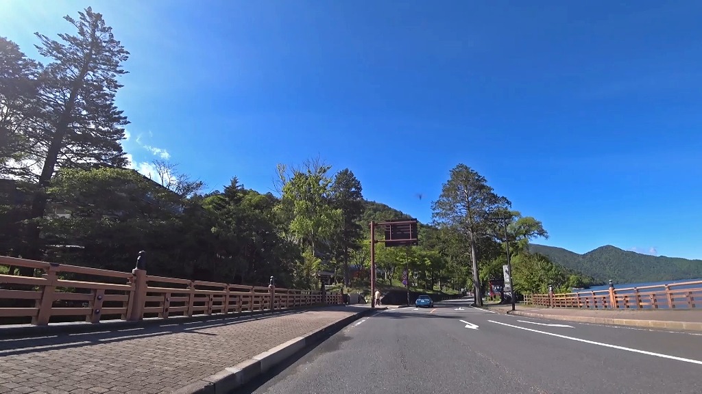 右に中禅寺湖を望む片側一車線の道を進みます。