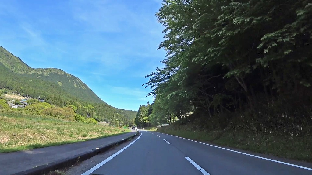 山間を進む片側一車線の道。