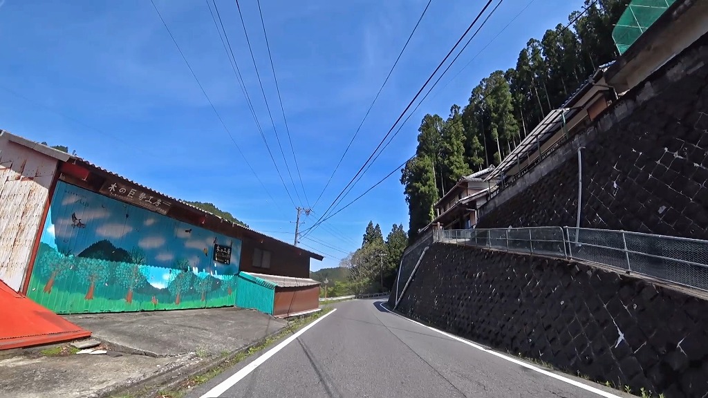 名張川沿いの良い景色なのですが、道の直ぐ脇に民家が建ち並んでおり、B歩行者注意