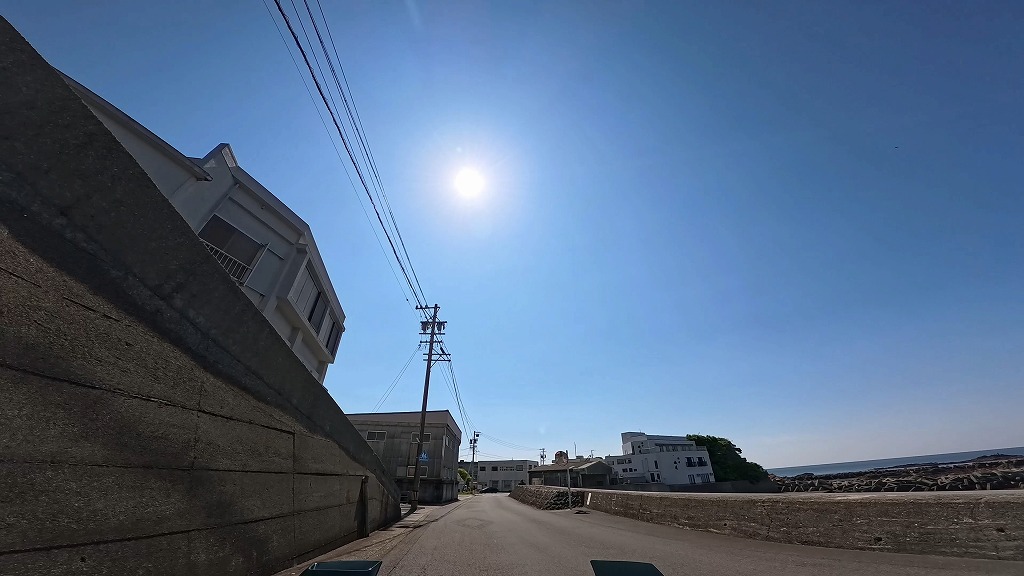 海が見えたと思ったら、民家が建ち並び、入り組んだ道幅の狭い場所へH歩行者・対向車に注意(19:49)