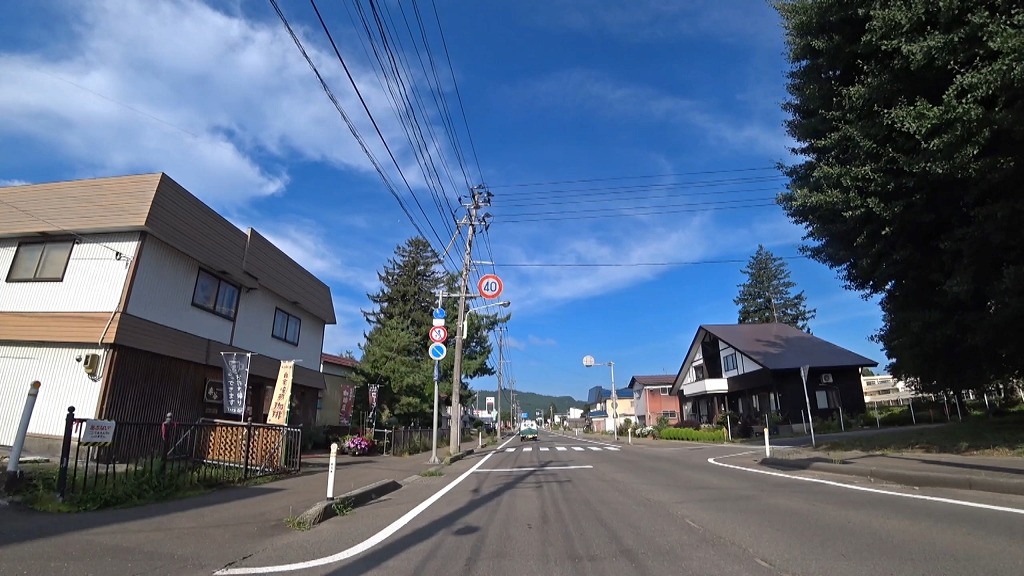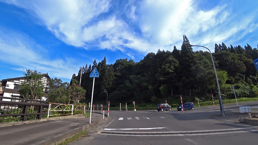 直ぐに現れる秋田県道282号仁郷大湯線(通称:栗駒道路)との@交差点1(信号なし)。(02:46)