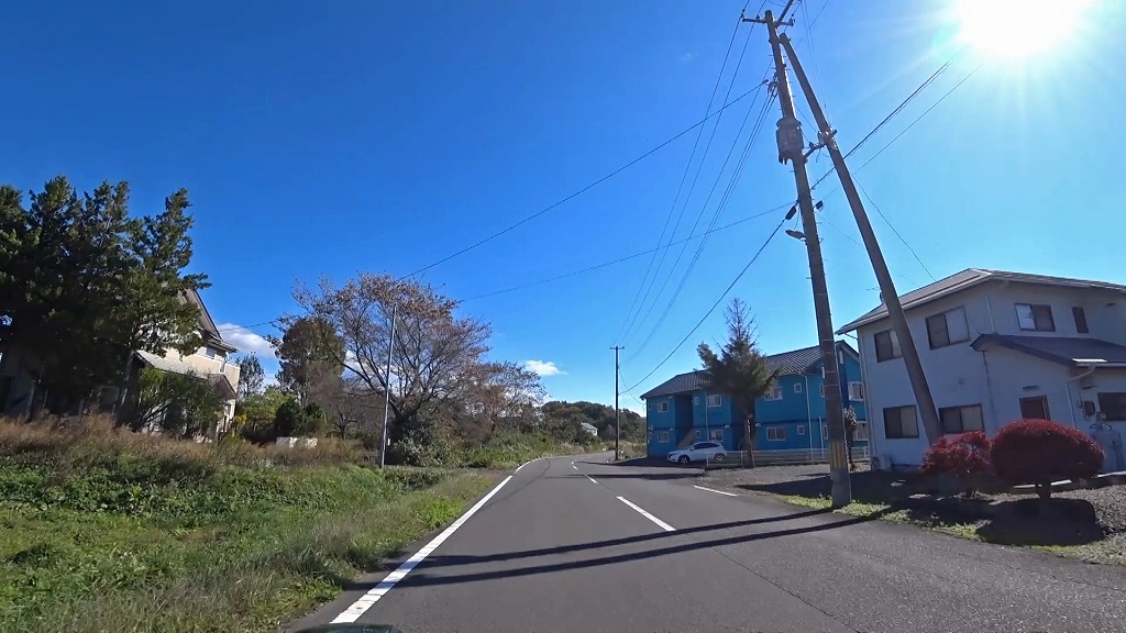 住宅の建ち並ぶ、案内標識等の無い交差点を曲がります。