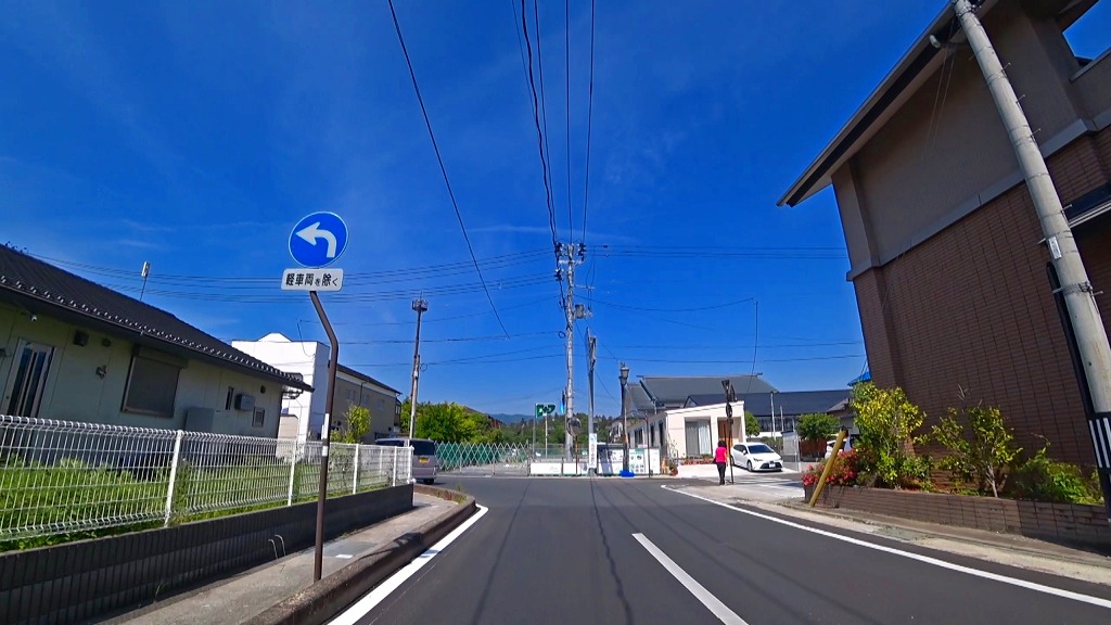 住宅や学校の建ち並ぶ場所へ。引き続き歩行者注意
