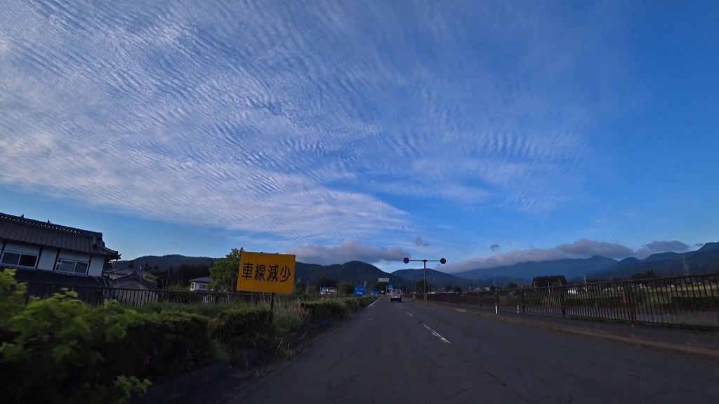 そんな走りやすい片側二車線の道でしたが、ここで左側の車線が無くなります。@車線減少(12:33)