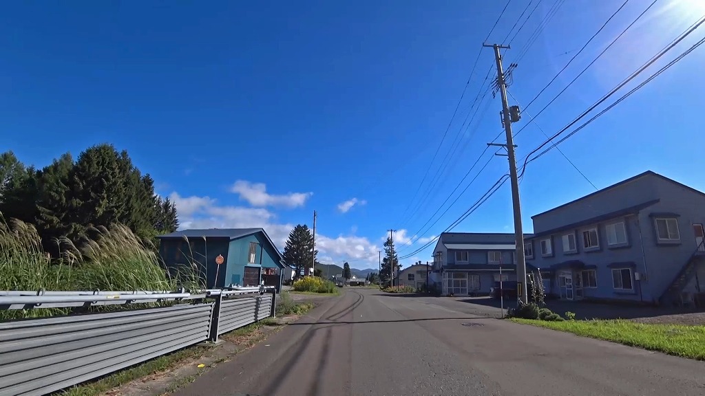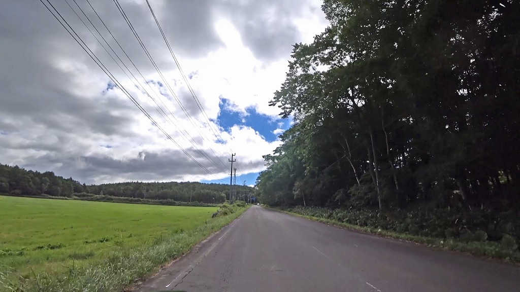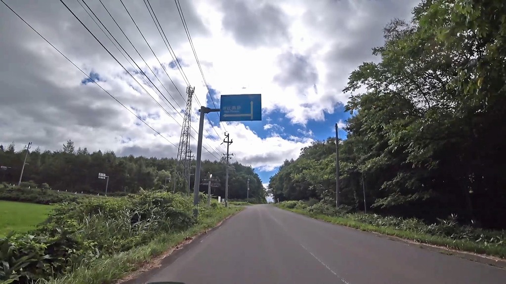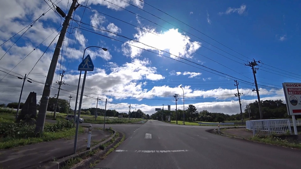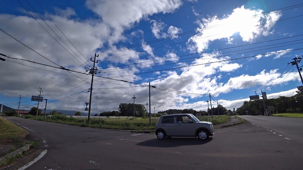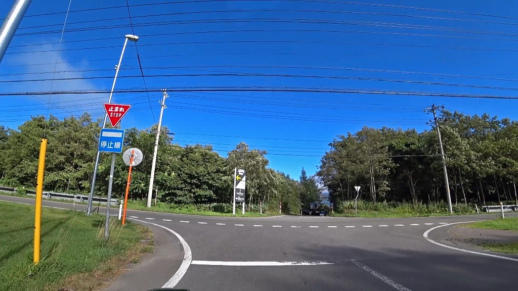 暫く進むと牧場の様な場所の先に@交差点1(信号なし)が現れます。