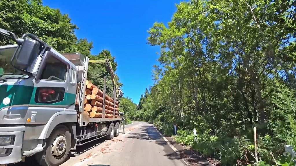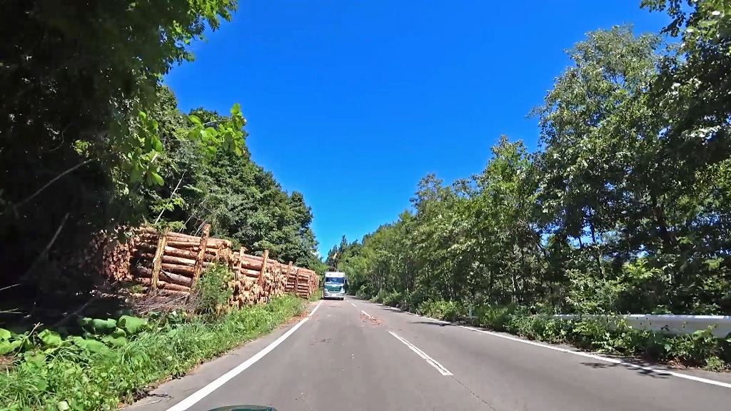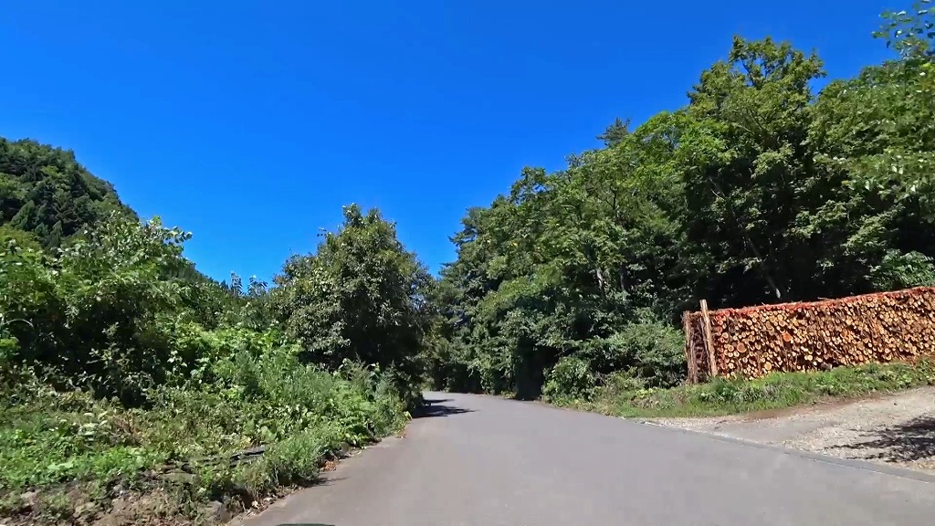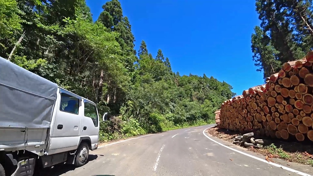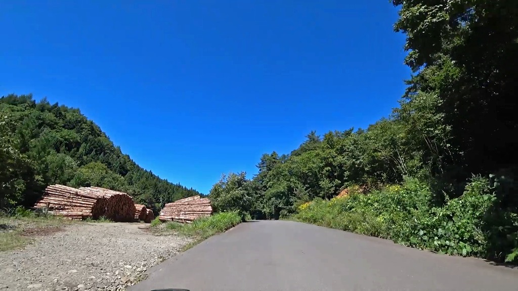 林道と言う事で、木材が置いてあったり、伐採作業を行っていたりします。