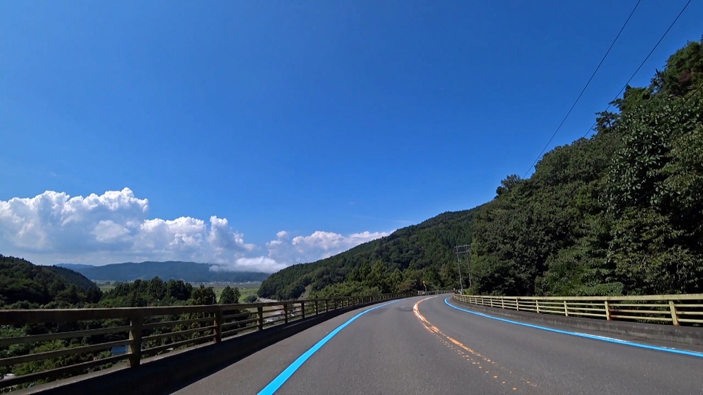 これまでの山道区間とは異なり、道幅が確りと確保され、カーブも緩やかな大きなカーブ。