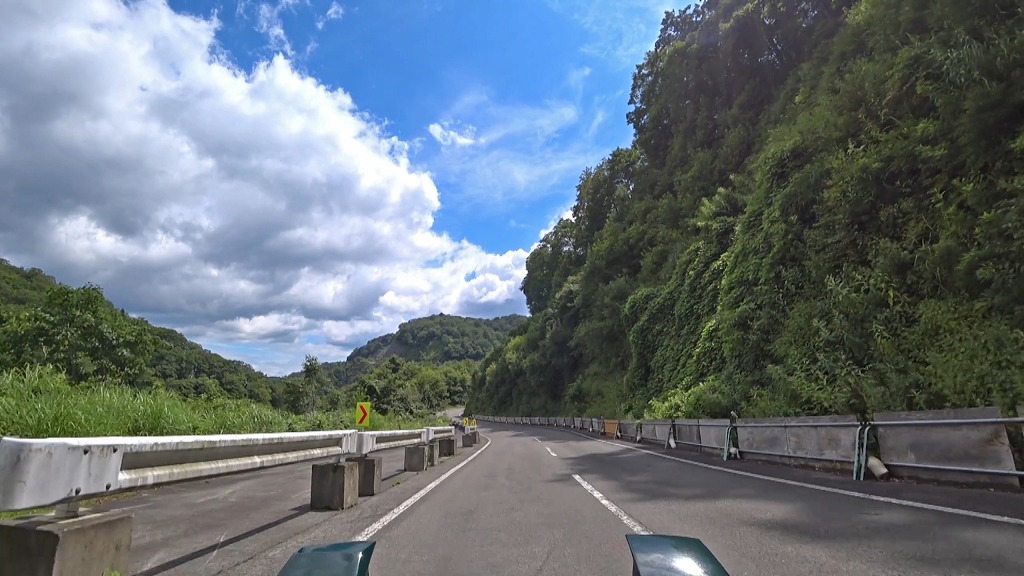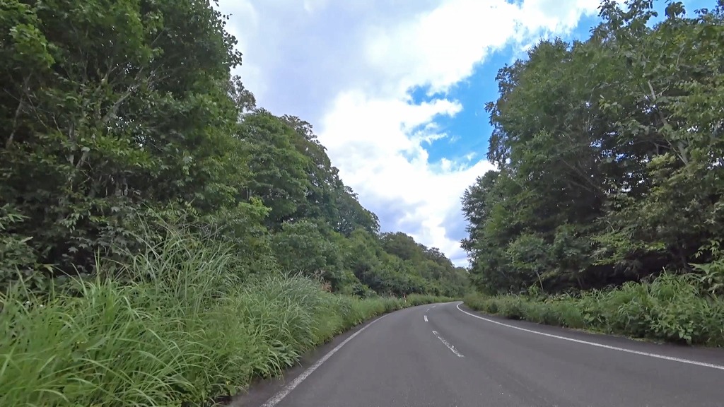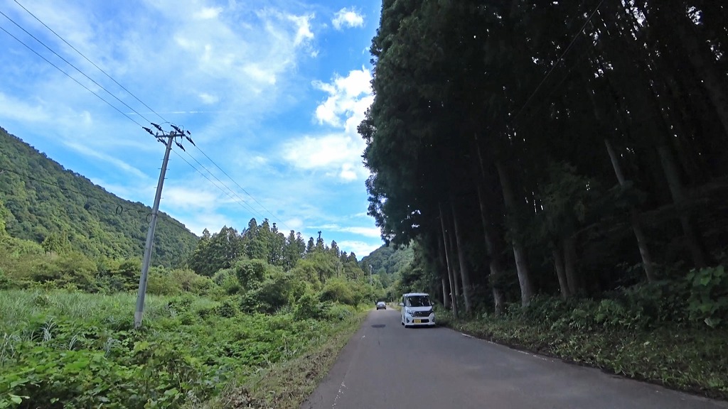 片側一車線の道で、車幅はそれなりにある印象ですが、路肩からの草木が車道側へ出てきており、やや窮屈に感じる。