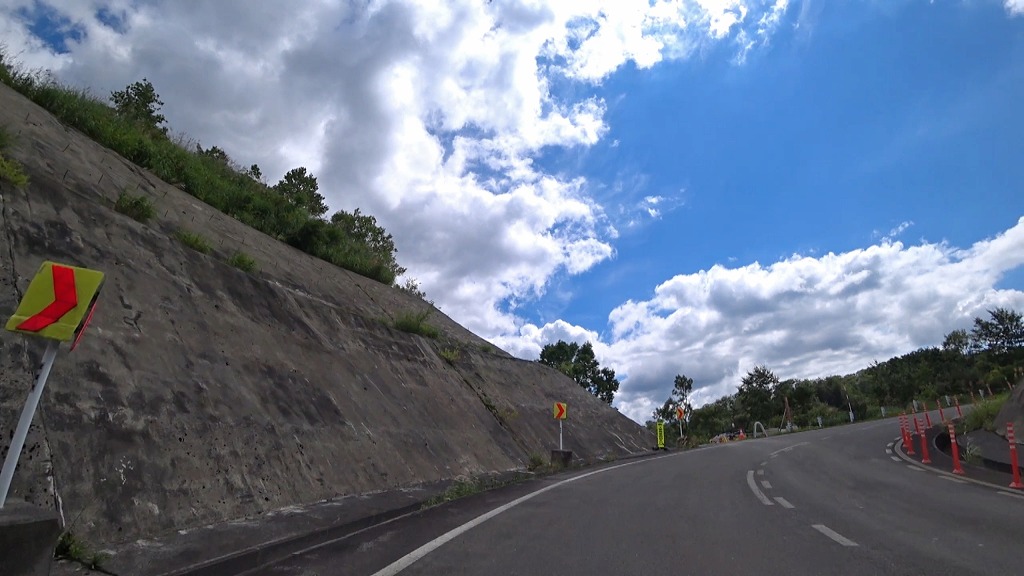 一部、工事の為、車同士のすれ違いが難しい場所がありますが、それ以外ではすれ違う事は可能な位の道幅が1km程続きます。
