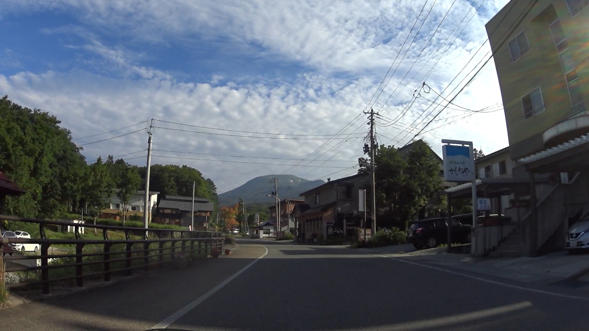 公園を進むと旅館街が現れ更に進むと交差点4(信号なし)を右折し山形県道114号月山志津線へ。